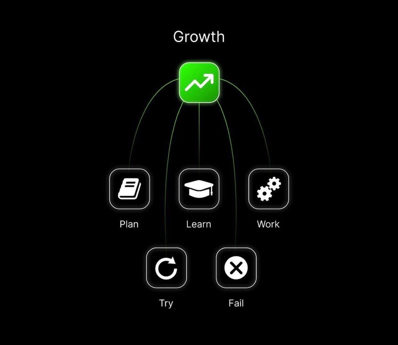 Diagram showing growth processes including plan, learn, and work, with options to try or fail.